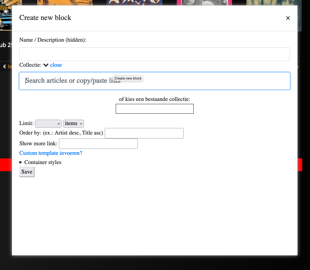 Daar staat het veld 'of kies een bestaande collectie'. Type daar de naam van de collectie die je in stap 1 hebt gemaakt. In mijn geval 'randys-mooiste-plaatjes'. Geef een heading in en zet de Limit op 1 row. Bij de 'Show more link' de url van de aangemaakte pagina (plakken). En sla het blok op (Save of control+s).